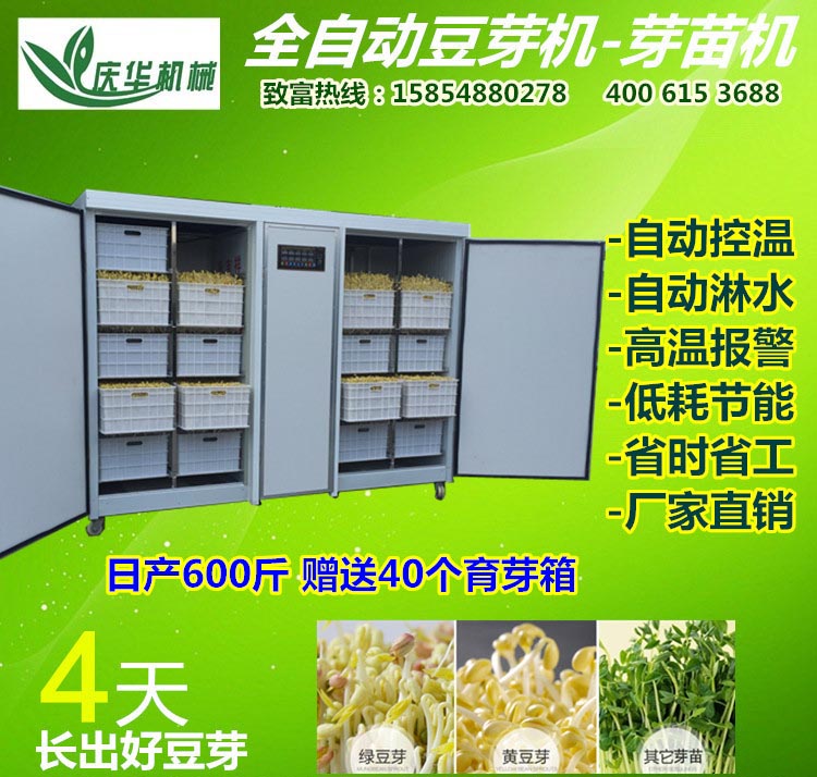 5、豆芽機(jī)產(chǎn)品特點(diǎn): 1)我公司生產(chǎn)的全自動(dòng)綠色無污染豆芽機(jī),是現(xiàn)代技術(shù)與傳統(tǒng)工藝的結(jié)合。豆芽機(jī)通過微電腦自動(dòng)控溫、自動(dòng)加溫、自動(dòng)顯示溫度、自動(dòng)淋水,實(shí)現(xiàn)了生產(chǎn)過程的全自動(dòng)化,具有省時(shí)、省工、低耗、無噪音等特點(diǎn)。 2)用我公司豆芽機(jī)生產(chǎn)的豆芽比傳統(tǒng)手工生產(chǎn)周期短質(zhì)量好,一般手工生產(chǎn)豆芽的周期,夏季需4-5天,冬季需要7-8天,而豆芽機(jī)生產(chǎn)豆芽只要3-4天即可,且不受地理環(huán)境、氣候條件和季節(jié)的影響。 3)我公司豆芽機(jī)生產(chǎn)的豆芽不僅種類多,而且產(chǎn)量高,一斤豆種可生產(chǎn)10斤左右的豆芽。且人工控制的環(huán)境下,豆芽生長(zhǎng)均勻一致,潔白鮮嫩、清脆多汁,口感清爽;不僅食用安全、營養(yǎng)豐富,還具有一定的食療保健作用。 4)節(jié)省勞力,操作方便。將浸泡后的豆種放進(jìn)豆芽機(jī)育芽箱內(nèi),就不用管了,它會(huì)自動(dòng)加溫,自動(dòng)淋水,經(jīng)過3-4天時(shí)間就可生產(chǎn)出潔白脆嫩的豆芽。 5)減少爛芽現(xiàn)象。豆芽生長(zhǎng)的爛芽現(xiàn)象多發(fā)生在培育后的三天左右,由于手工生產(chǎn)豆芽的周期長(zhǎng),易出現(xiàn)爛芽現(xiàn)象,然而采用豆芽機(jī)生產(chǎn),三天左右豆芽已經(jīng)成熟,可以采收食用,不會(huì)有爛芽現(xiàn)象發(fā)生。