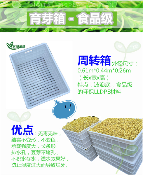 6、豆芽機結(jié)構(gòu)特點及功能(可根據(jù)客戶需要訂做): 4)周轉(zhuǎn)箱的外徑尺寸:0.61m*0.44m*0.26m(長寬高),特點:波浪底,食品級的環(huán)保LLDPE材料,無味,結(jié)實不變形,不變色,承載強度大,長條形排水孔,豆芽不堵孔,不積水存水,透水效果好,防止?jié)穸冗^大而導致爛牙。
