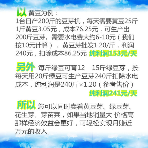 5、豆芽機產(chǎn)品特點: 5)減少爛芽現(xiàn)象。豆芽生長的爛芽現(xiàn)象多發(fā)生在培育后的三天左右,由于手工生產(chǎn)豆芽的周期長,易出現(xiàn)爛芽現(xiàn)象,然而采用豆芽機生產(chǎn),三天左右豆芽已經(jīng)成熟,可以采收食用,不會有爛芽現(xiàn)象發(fā)生。