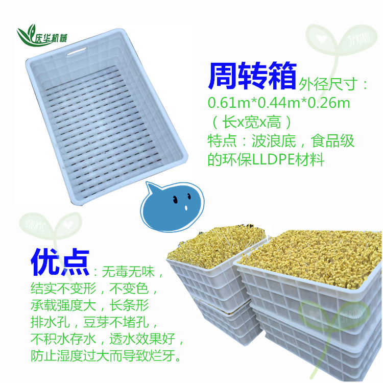5)減少爛芽現(xiàn)象。豆芽生長的爛芽現(xiàn)象多發(fā)生在培育后的三天左右,由于手工生產(chǎn)豆芽的周期長,易出現(xiàn)爛芽現(xiàn)象,然而采用豆芽機生產(chǎn),三天左右豆芽已經(jīng)成熟,可以采收食用,不會有爛芽現(xiàn)象發(fā)生。 6、豆芽機結(jié)構(gòu)特點及功能(可根據(jù)客戶需要訂做): 4)周轉(zhuǎn)箱的外徑尺寸:0.61m*0.44m*0.26m(長寬高),特點:波浪底,食品級的環(huán)保LLDPE材料,無味,結(jié)實不變形,不變色,承載強度大,長條形排水孔,豆芽不堵孔,不積水存水,透水效果好,防止?jié)穸冗^大而導致爛牙。 7、價格:價格即可購得