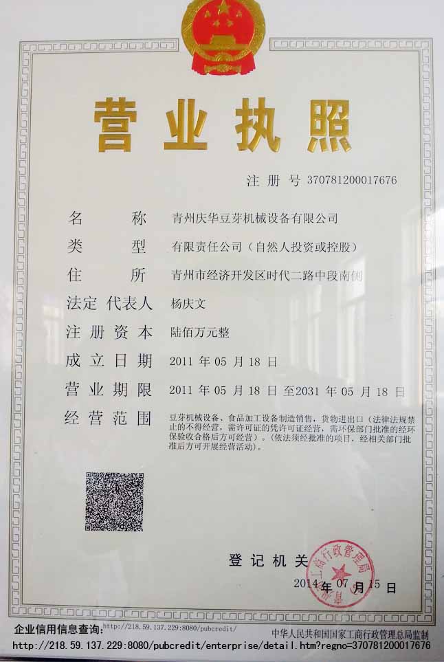 公司名稱:山東慶華豆芽機(jī)械設(shè)備有限公司 (原青州豆芽機(jī)械廠)